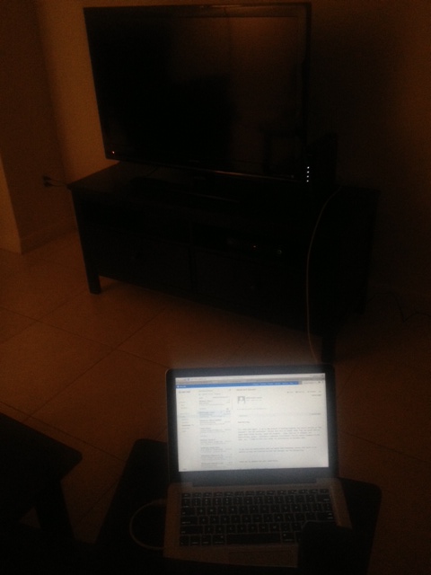 So now, I sit here with this finagled set-up: In case you can’t tell, that’s a short USB cord stretched from my cable box to a haphazardly placed kitchen chair.