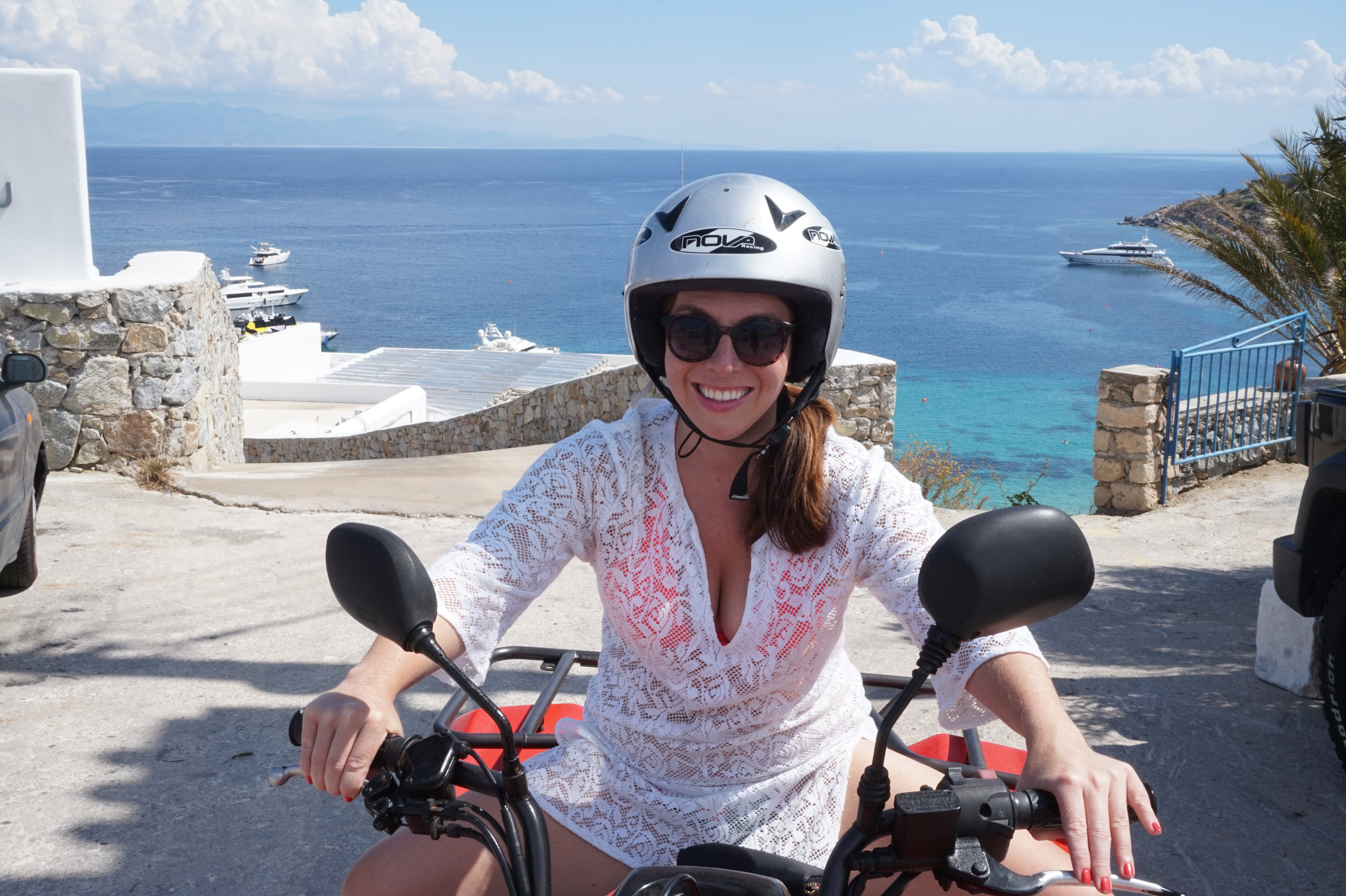 I have never operated a motorized bike before, and in all honesty, was pretty frightened to do so, especially in a place I was unfamiliar with. For as much as I know about sports, in the end, I’m a girly girl. I love shopping and nail polish and don’t mind letting men take the lead. Riding a motorized bike is about the antithesis of Alicia as it gets and I was vocally freaked out about it. I get lost easily, am not good with directions and am not the most coordinated person. Upon learning that I drove a rental car in Greece, my friends who know and have driven with me were mortified. They were even more shocked to learn that I cruised around for four days in Greece on an ATV. Most were surprised that I lived to tell about it. In the end, though, renting the ATV ended up being one of my favorite parts of our trip. Cruising around the island on that little ATV in my bikini and feeling the air blow through my hair was such a freeing experience. I felt young and alive. I felt like I could do anything and that the world was at those fingertips wrapped so tightly around two handlebars. Seriously, though, I gripped those suckers so tight that I may have developed early onset Carpal Tunnel Syndrome. It hurt. Bad.